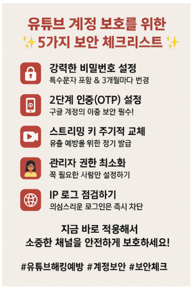 오늘도 멋진 유튜브 채널 운영을 위해 열심히 달리고 계신가요? 요즘 들어 안타깝게도 ‘유튜브 해킹’이라는 말이 자꾸 들려서 걱정이 되시죠? 얼마 전 실제로 큰 피해 사례가 있었답니다😥. 그래서 오늘은 여러분이 소중히 운영하는 유튜브 채널을 안전하게 지킬 수 있는 보안 방법들을 하나하나 친절히 안내드릴게요!