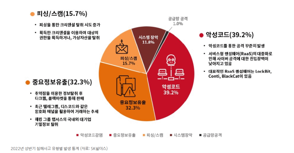 유형별 사고 발생 통계로는 악성코드를 통한 침해사고가 39.2%로 가장 높은 비중을 차지했으며, 중요 정보 유출이 32.3%, 피싱/스캠이 15.7%를 차지했다. 그 외 시스템 장악이 11.8%, 공급망 공격이 1.0%로 뒤를 이었다.