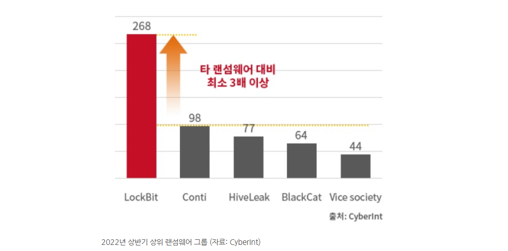 RaaS 랜섬웨어로는 ‘록비트(LockBit)’, ‘콘티(Conti)’, ‘블랙캣(BlackCat)’ 등이 대표적이다. 특히 상반기 가장 활발하게 활동한 랜섬웨어그룹은 ‘록비트’로, 타 랜섬웨어 그룹보다 3배 이상 많이 활동한 것으로 관측됐다. 2019년 9월부터 활동을 시장한 록비트는 파일을 ‘.lockbit’ 확장자 파일로 암호화하며, 부분 암호화 기술을 사용해 다른 랜섬웨어에 비해 암호화 프로세스 속도를 높인 것이 특징이다. 이
