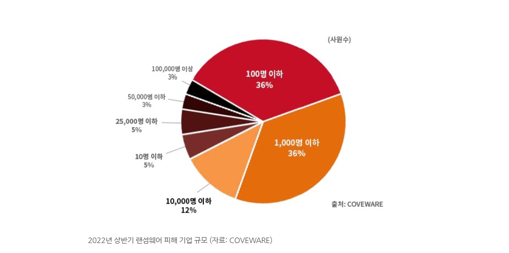 15.7%를 차지한 피싱/스캠은 가상자산 탈취를 목적으로 크리덴셜 정보 수집에 주로 이용됐다. 공격자는 피싱을 통해 대상의 크리덴셜을 획득하고 이를 이용해 암호화폐 거래소에 접근, 피해자의 가상자산을 탈취한다. EQST 측은 가상자산 거래량이 늘어난 만큼 암호화폐 거래소 이용자를 타깃으로 한 피싱 공격이 증가하고 있어 각별한 주의가 필요하다고 조언했다. 한편 2022년 상반기 랜섬웨어 피해 기업의 규모 통계를 살펴보면, 사원 수 1천 명 이하 규모의 기업이 72%를 차지한 것으로 나타났다.