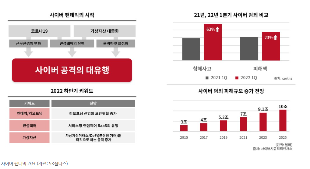 SK쉴더스 EQST는 코로나19로 인해 디지털 전환이 가속화되고, 가상자산이 대중화되면서 일명 ‘사이버 팬데믹’이 시작된 상황이라고 분석하고 있다. 2021년 1분기와 2022년 1분기를 비교해보면 침해사고가 63% 늘었으며 피해액도 23% 증가했다. 2015년 3조 원 규모였던 사이버 범죄 피해규모는 2021년 7조 원을 지나 2025년에는 10조 원 규모까지 늘어날 전망이다. 이에 EQST는 하반기 주목해야할 키워드로 △코로나19 이후 디지털 전환의 가속화로 ‘리오프닝’ 관련 산업 공격 △‘가상자산’ 거래 대중화로 관련 공격 확대 △RaaS 포함 랜섬웨어 공격 등을 선정했다. 특히, 코로나19로 위축됐던 경제활동이 재개되면서 호텔, 항공사, 여행사 등을 포함하는 관광산업
