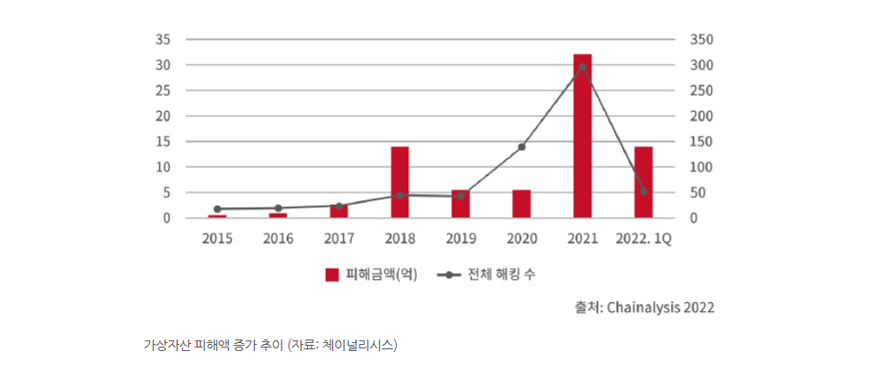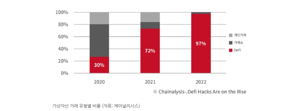 여기에 탈중앙화 금융인 DeFi가 새롭게 등장하면서 가상자산을 타깃으로 한 공격이 더욱 많아질 것으로 예상된다. 체이널리시스(Chainalysis)는 2022년 상반기 동안 도난당한 가상자산이 16억 8천만 달러(한화 약 2조 1554억 원)에 달하며, 이 중 97%가 DeFi 플랫폼을 통해 발생했다고 발표했다. 거래소에 의존하던 기존 방식에서 탈 중앙화 방식의 DeFi 시장 규모가 증가하면서 DeFi 플랫폼을 노