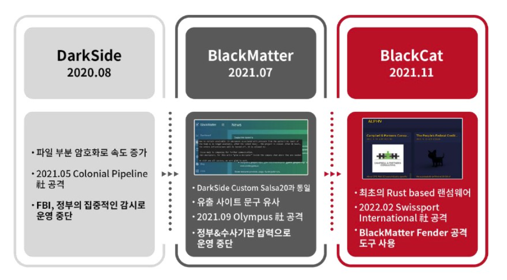 RaaS인 블랙캣(BlackCat) 랜섬웨어도 기승을 부렸다. 12명의 피해자에게 총 1,400만 달러를 요구하며 비용을 지불하지 않을 경우 디도스(DDoS) 공격을 수행할 것이라고 협박한 블랙캣 랜섬웨어 그룹은 기존에 사용하지 않던 러스트(Rust) 언어를 사용해 랜섬웨어를 제작했다. 러스트 기반의 블랙캣은 리눅스와 윈도우 시스템에서 모두 실행 가능해 범용성이 뛰어나고, 많이 알려지지 않은 언어라 보안 시스템 우회에 용이하며, 리버스 엔지니어링을 이용한 분석에 어려움을 주고 있는 것으로 파악된다.