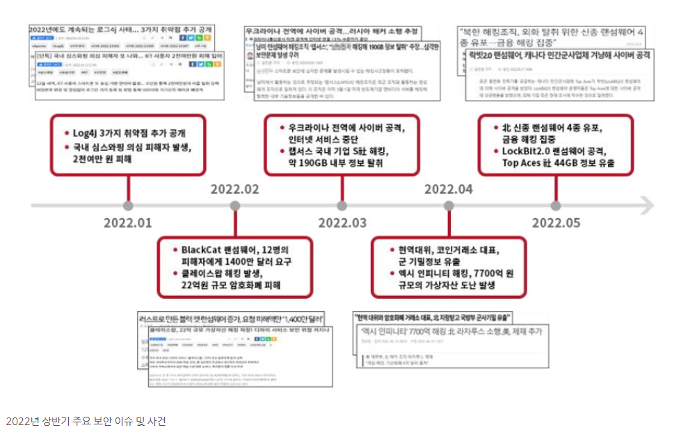 3월에는 러시아가 우크라이나를 침공하면서 위성 통신망을 해킹하고 사회기반시설에 대한 공격을 시도하는 등 국제적 위협 상황이 발생했다. 우크라이나는 인터넷 연결과 전기 공급 등 측면에서 피해를 입었다. 이러한 사례는 국가 안보에 사이버 공격 대비가 필수라는 점을 전 세계에 널리 각인시켰다.