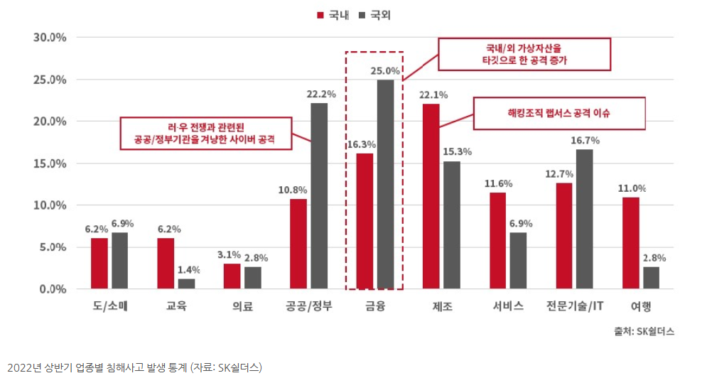SK쉴더스 산하 국내 최대 규모 화이트해커 전문가 그룹인 ‘EQST(Experts, Qualified Security Team)’의 분석에 따르면, 2022년도부터 탈중앙화금융(DeFi) 시스템 사용자가 늘어나는 등 가상자산 거래가 활성화됨에 따라 가상자산 탈취를 위한 금융권 대상 공격이 가장 높은 비중을 보인 것으로 나타났다. 금융권을 대상으로 한 침해사고는 2022년 상반기 전체 사고 중 국내와 국외 각각 16.3%와 25%의 비중을 차지했다. 국내에서 가장 높은 통계를 기록한 업종은 제조업 침해사고로 22.1%를 기록했으며, 특히 해킹 그룹 ‘랩서스’가 국내 최대 제조사인 S사와 L사의 핵심 중요 정보를 탈취하는 데 성공한 사건이 큰 이슈가 됐다. 국외에서는 러시아-우크라이나 전쟁의 영향으로 인해 기반 시설을 노린 사이버 공격이 대대적으로 이뤄진 것이 통계에 반영돼 공공/정부기관을 겨냥한 침해사고가 22.2%로 높은 비중을 차지했다.