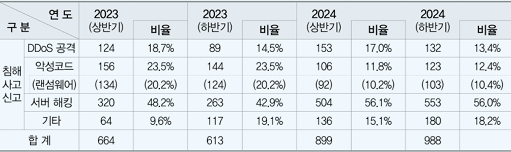 유형별침해사고신고현황(출처: KISA 2024년 상반기사이버위협동향보고서)