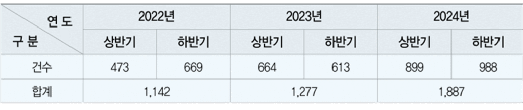 한국인터넷진흥원에서 발표한 연도별 침해사고 신고 건수에 따르면 2024년 상반기 침해사고 신고 건수는 899건으로 2023년 상반기 대비 35% 증가하였습니다. 이는 Web shell 및 악성 URL 삽입, DDoS 공격 등이 크게 증가했기 때문입니다.
