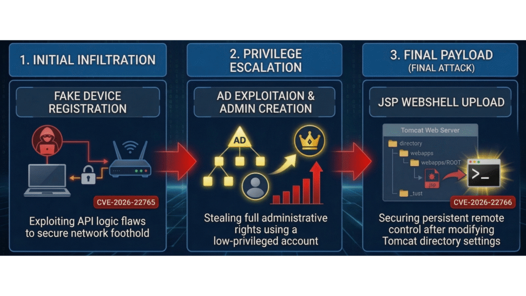 - Initial Infiltration: Exploiting logical flaws in the API to register fake devices and establish a foothold within the internal network.